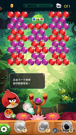1、拿起弹弓,匹配、爆掉彩色泡泡,解救小怪物,弹爆坏猪猪