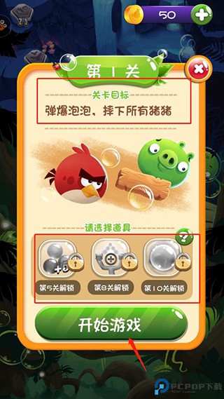 3、每个关卡都有关卡目标,闯关之前记得要看看目标是什么哦,另外还可以选择使用道具,然后点击开始游戏吧;