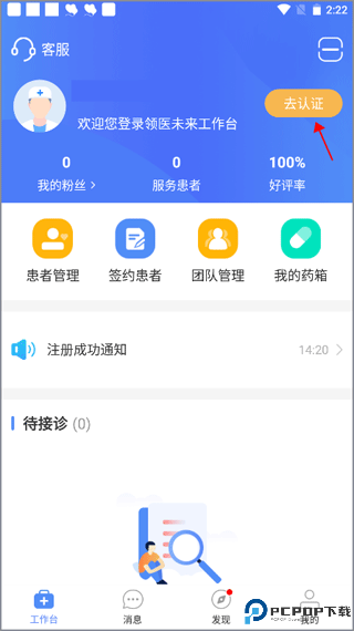 1、输入手机号和验证码进入软件后,点击菜单栏“工作台”的“去认证”。