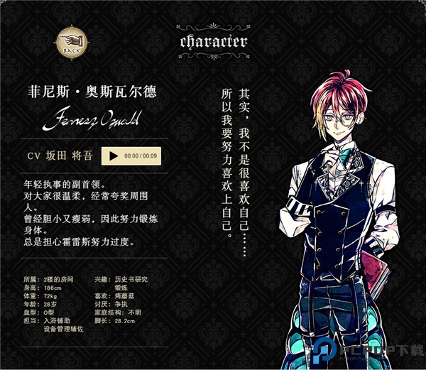 为自己的执事工作感到自豪。时刻挂念要用心照顾主人。温柔又可靠。深受其他执事信赖。很少说起自己的事,是个很神秘的人。