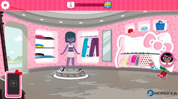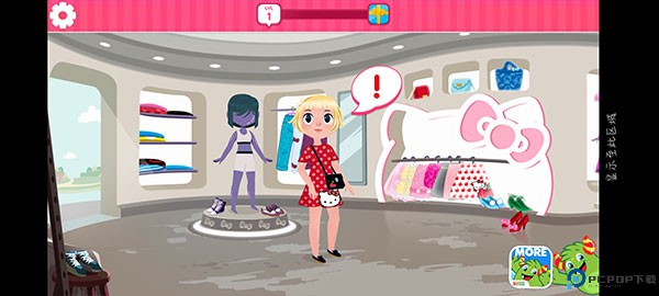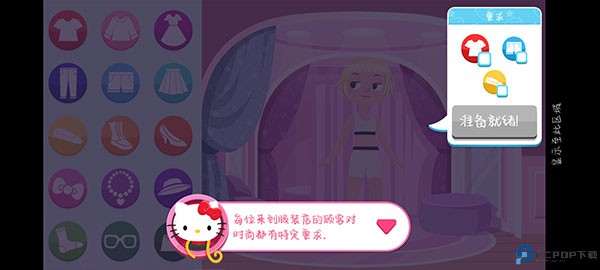 2、玩家将来到凯蒂猫的服装店铺,点击“!”接待第一位顾客。