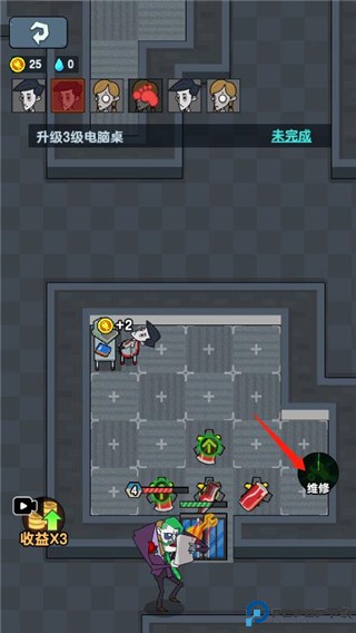 2、在确定好办公室后,优先升级床和建造两座炮塔,然后提升电脑等级以快速赚取金币。
