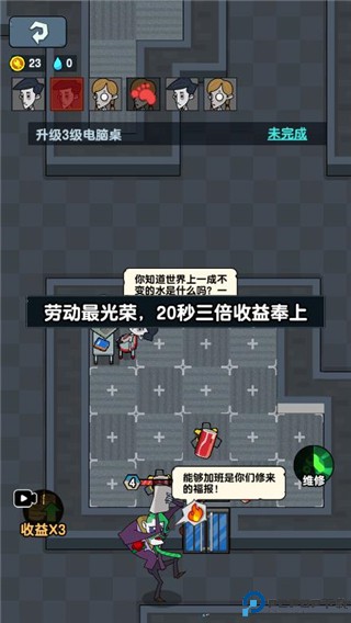 1、游戏以办公室为背景,玩家需要灵活思考,合理挑选道具完成摸鱼任务。