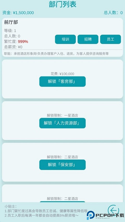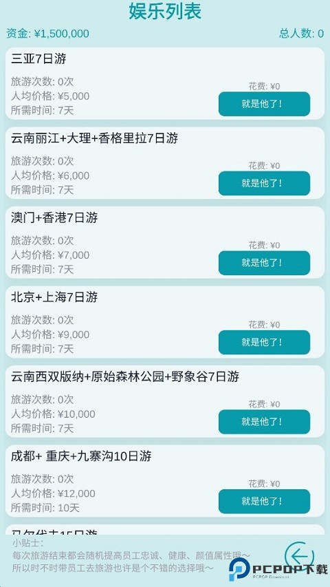 这里的娱乐类似于公司团建活动,每次旅游都能提升员工的各项属性,所以时不时的带员工去旅游是个非常不错的选择。