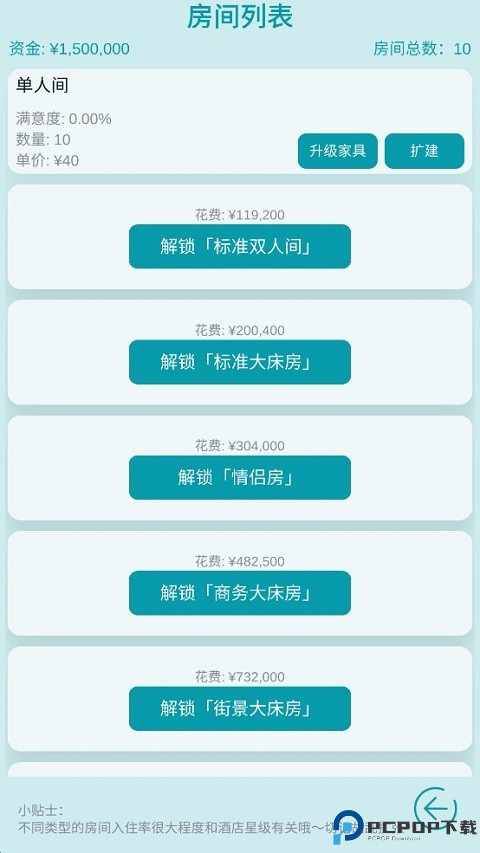 作为酒店经营主题的模拟游戏,建造不同类型的房间可满足不同客户需求。想要解锁更多房间,前期是需要具备充足的资金。期间,你可以通过升级家具等级来吸引更多顾客并提高房间价格。