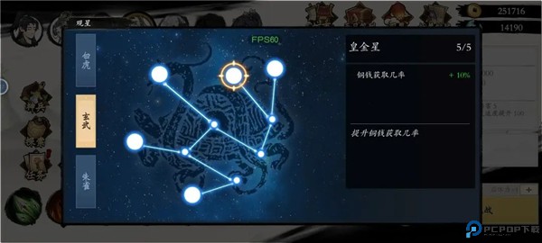 2、再去点观星!观星在界面右上角,观星没点满前可以重置!喜欢刷图的把朱雀系体力恢复加速点出来!然后旁边的挂机时长后面再点!