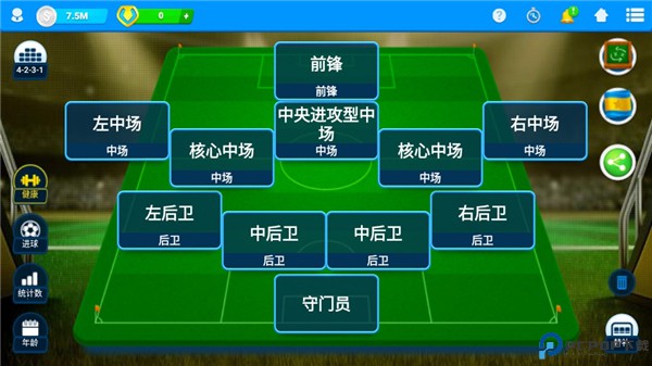 2、阵型,经理们可以自由设定球队的阵型站位(可保存2套设置阵型),设置球员的先发或替补位置。