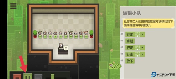 2、根据要求我们可以发现需要员工向下行走一步,然后拿起再向前走两步放下,然后就可以将相关的指令放入到右边空白处,注意顺序不要搞错了。