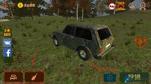 1、打开狩猎模拟器游戏后你可以在游戏首界面中选择你的汽车和武器,右边靶信图案为任务