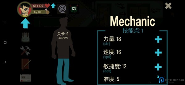 4、前期可能资源不太足,我们要尽量躲避丧尸寻找资源,我们可以看到当前角色的力量、速度、敏捷度和准度等属性,