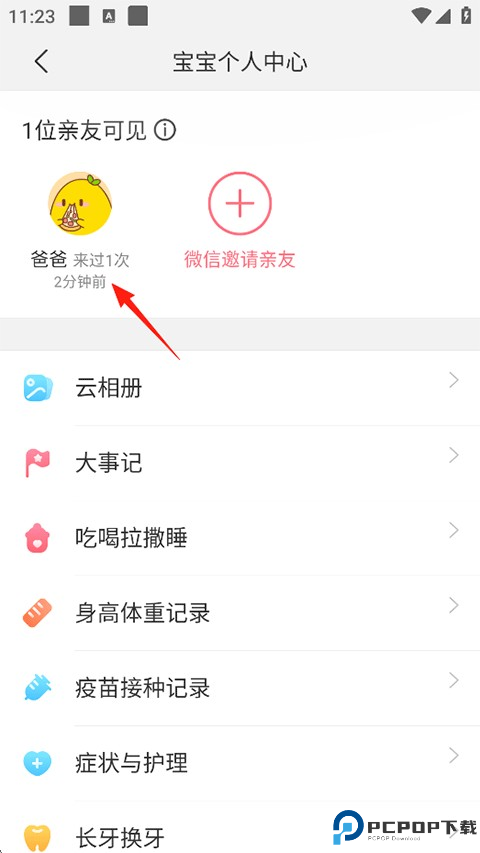 2、可以看到当前登录账号为爸爸角色以及爸爸访问的记录,点击侧边的微信邀请亲友以邀请宝宝其他亲属加入。