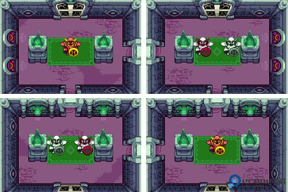 从台上跳下,向左回到暗之海拉尔城的入口处,用钥匙打开右边的门,进入(下楼)。沿着走廊径直来到有四个骷髅的屋子,按图9所示分身反弹炮弹,即可继续通行。
