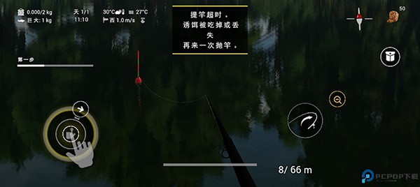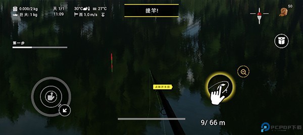 5、耐心等待就可以让鱼儿上钩了,浮标动了,可以点击右下角的放大键来放大浮标来观察浮标的动向,手机振动了代表有鱼上钩了,钩子收晚了会导致鱼跑掉的;