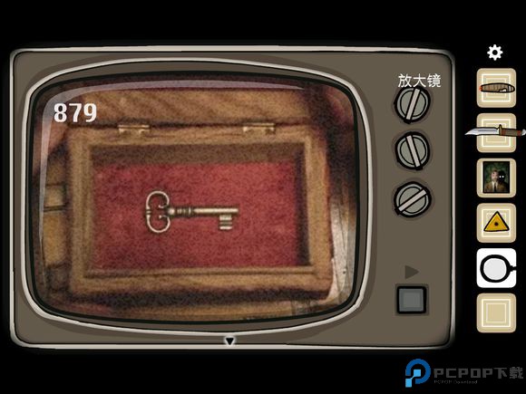把钟旁边的纸拼好,翻到背面,得到频道945。电视调到945后得知烧画里的灵魂,在柜子上得到雪茄,烧画上的灵魂得到金钥匙,开橱柜的锁。