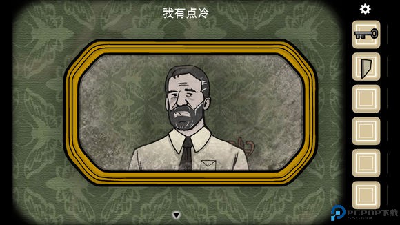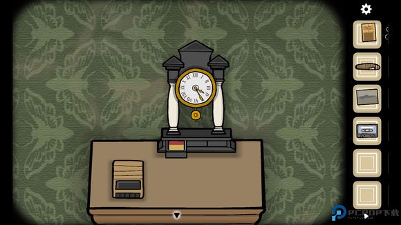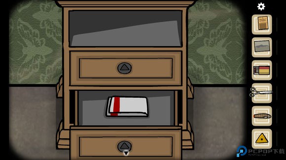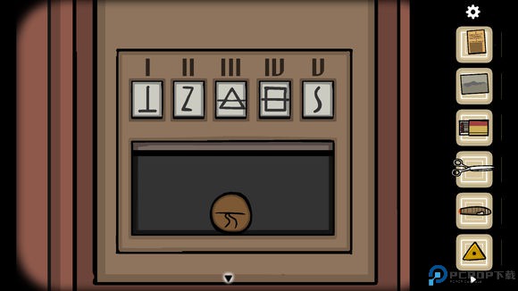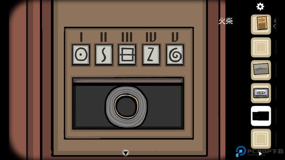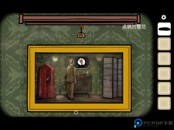 来到镜子面前,点燃雪茄烟,吸烟,每点击人物一次,会吐出一个符号,记下符号,来到柜子,打开下面的柜门,会看到一个五位密码的密码箱。输入密码后拿到胶布。