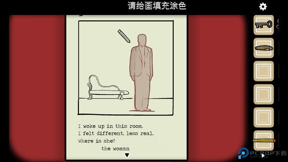 再打字机输入the woman后,会提示你上色,不需要上太精细,随便涂一涂就好。最后会出现一个钥匙的形状,上色后获得钥匙。这个钥匙可以打开柜子。