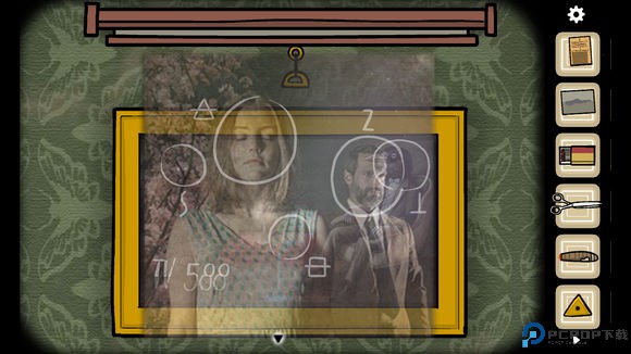 打开柜子后,拿到拉手,打开装证据的文件夹后得到磁带,胶片与报纸。回到房间,电视下面有两个插头。左边断掉了,先接上右边。回到柜子发现投影仪可以工作了,放入胶片,点击上面的旋钮打开,去对面看那幅画。把拉手装在画上的投影布上,拉下投影布,按照参照物,先是对齐红色柜子顶,得到数字V和符号X,再对齐镜子,得到熟悉IV和符号·。别忘记拿投影布左上的照片。
