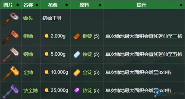 玩家可以使用锄头挖土及耕种。锄头升级后,长按左键蓄力可以一次锄一片地,锄地的面积大小取决于你你锄头的等级以及蓄力时间的长短。锄头可以用来挖远古斑点从而得到隐藏的物品。