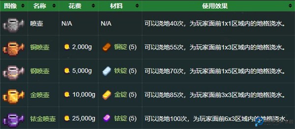 可以用来给作物浇水。它可以装任何类型的水,也可取井水。如果你一天没有浇水的话,农作物将会延迟生长甚至开始枯萎。但若赶上雨天则不需要给农作物浇水。