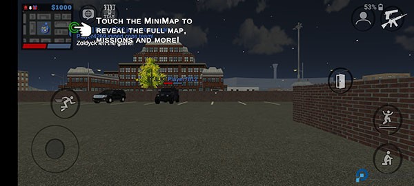 2、玩家可以自由操作角色奔跑和跳跃,右上角可以选择游戏武器;