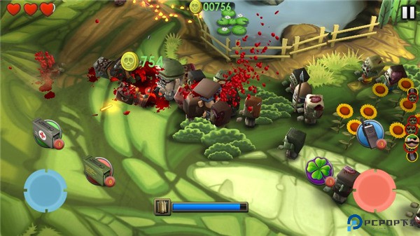 3、画面继续采用广受欢迎的 2.5D构图,并作了动画渲染,主角和怪物都是方块的造型,非常Q,虽是击杀僵尸但是并没有一丝血腥而是很有喜感。游戏的场景也相当精致细腻。