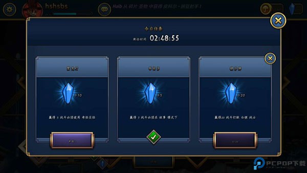 任务:在游戏的大厅页面点击任务可以查看每日任务,这里每天会为大家派出三个任务,完成任务后可以领取到相应的宝石奖励。