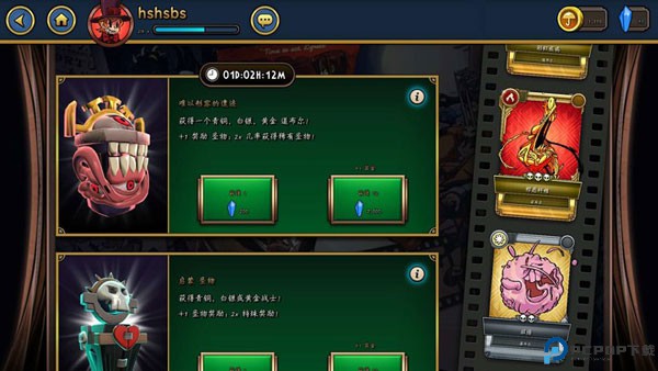 圣物:进入圣物页面后玩家可以在这里购买到不同等级的生物宝箱,圣物宝箱一共分为五类但是只有两种宝箱是可以购买的,其他的宝箱需要玩家去收集碎片或者等待开启时间才可以获得。