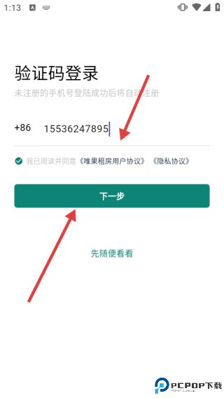 1、在唯果租房验证码登录页,填写手机号,勾选协议后点击【下一步】。