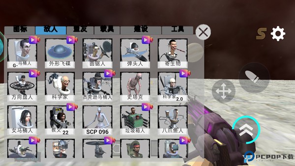 3、点击左侧箱子按钮,玩家可选择要添加的敌人,如马桶人、圆锯人、弹头人、寄生物、外星飞碟等;
