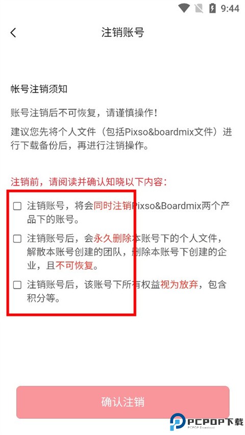 2、 注销前,请仔细阅读注销须知,并勾选相关内容。