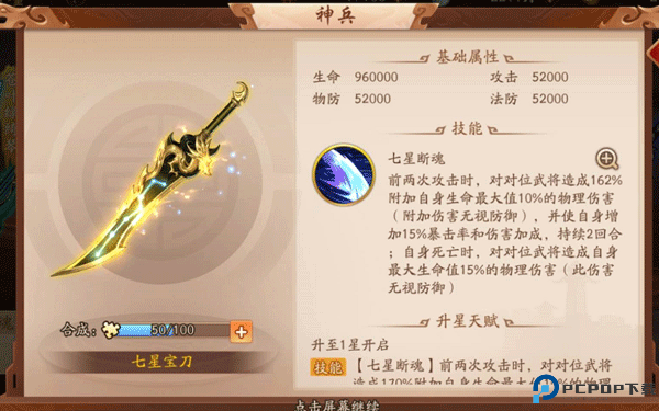 浅解:至今为止唯一金+品质的金神兵,与青釭剑相比,同样作为主要输出类型的金神兵,从二者技能来区分,青釭剑攻守兼备,可以称之为坦克杀手,更适合主要输出点,回怒快的,或者容易释放大招的武将,来触发百分比伤害。而七星宝刀的触发,比较特殊,高额的生命值百分比伤害,取决于自身的生命值,不管是前两次出手的额外伤害还是死后诅咒般的“将你带走”这一击,都意味着持有者自身的生命值,意味着输出的高低。但是玩家们需要注意的是,这里小编推荐七星宝刀一定要在前排使用,七星宝刀的持有者在阵亡的时候,还能造成一段自身生命百分比的伤害,前排的武将持有,更便于触发伤害