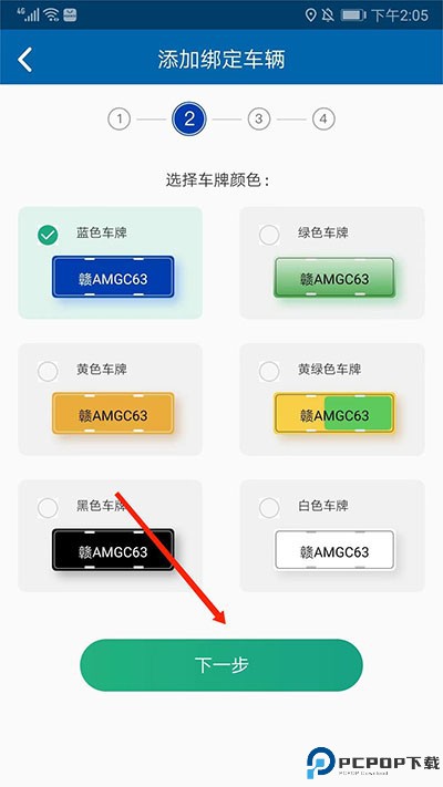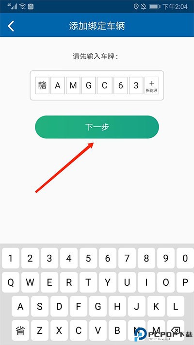 3、进入绑定车辆界面,输入车牌号后,点击“下一步”。
