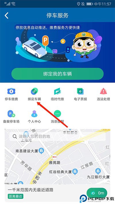 2、在停车服务界面中,选择“绑定车辆”选项。