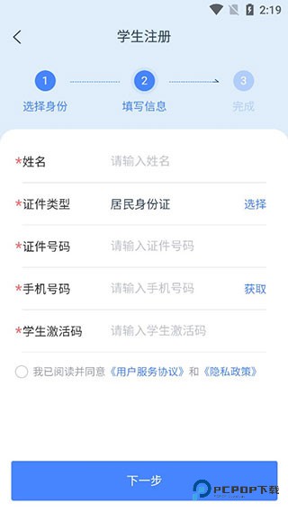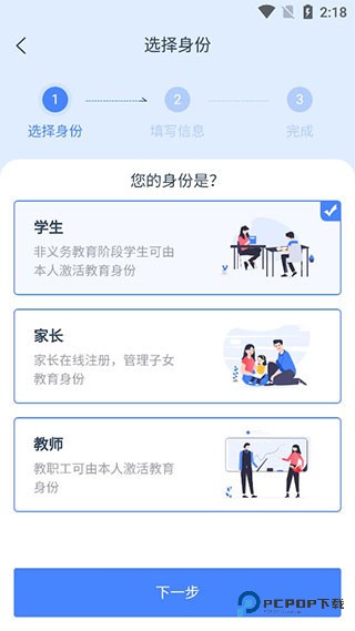 2、选择登录身份,学生、家长或者教师,点击下一步。
