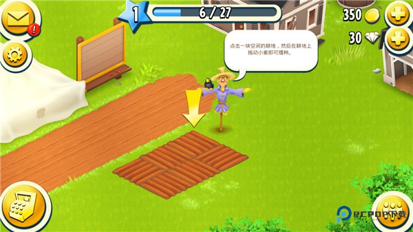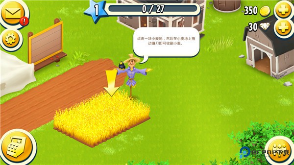 4、按照教程提示,点击小麦,选择镰刀,然后拖动镰刀收割整片小麦。