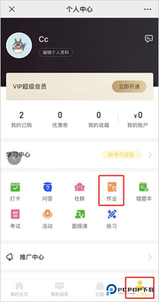 ①个人中心入口,通过【个人中心】→【学习工具】→【作业】