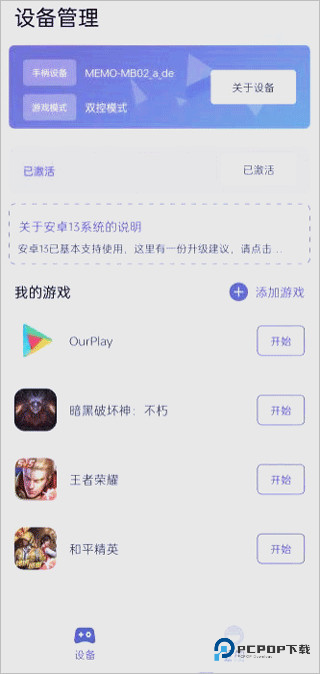 4、当设备的蓝灯持续亮起,且APP已成功识别到手柄设备,且游戏模式显示为“双控模式”时,表示设备已成功连接,完成激活后,点击“开始游戏”即可畅享游戏乐趣;