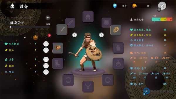 5、点击右上角的头盔可以打开角色界面,你可以在这里装备武器和防具,也可以对角色进行加点。