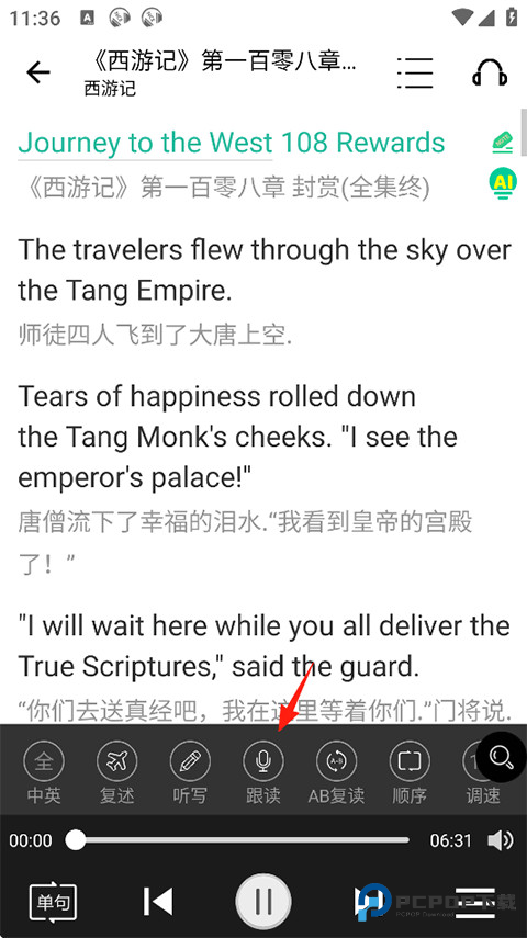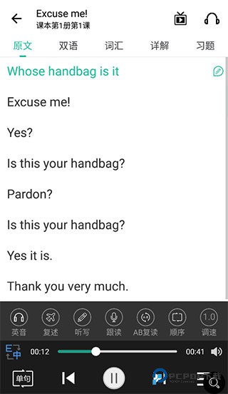 6、课程页游原文和双语两种模式切换,底部还可以选择“复述”、“听写”以及“调速”等快捷功能,帮助你根据自己的学习需要来调整。