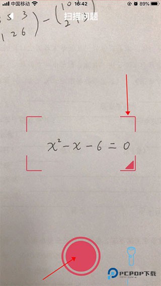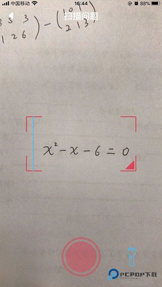 3、打开手机摄像头,将题目置于屏幕提示的区域内,然后点击下方的红色按钮;