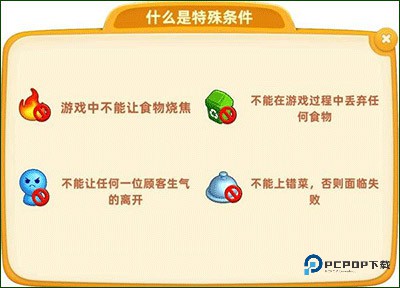特殊条件是指关卡的限制条件。如不能烧焦、不能上错菜等,在进入关卡时会有特别说明(如图)。一旦不小心触发,就会判定挑战失败,大厨需要特别注意限制条件哦。