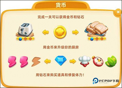 1、金币:完成关卡可以获得本关产出的金币(双倍加成道具、连击均可以提高金币的产出);金币用于升级设备和食材。