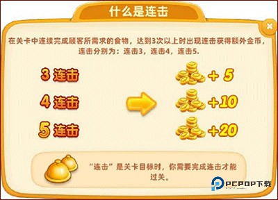 连击要求大厨在关卡中连续完成顾客所需求的食物,连续上菜达到3次以上时出现连击并可获得额外金币(两次及以下不计算连击)。最高连击为5连击,可额外增加20金币。