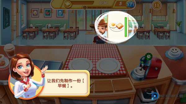 准备好成为世界大厨了吗?顾客们都等不及啦!即刻开始,让我们在小镇大厨游戏中学习如何烹饪吧!通过特色主题餐厅的触犯来展示您的烹饪技巧,首先客人来消费的同时,会有对于餐品的需要,玩家要根据其需求来制作美食,如图所示:
