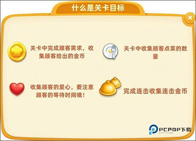 1、金币:即金币关卡。通过完成顾客需求,收集顾客支付的金币,达到目标营收金额。