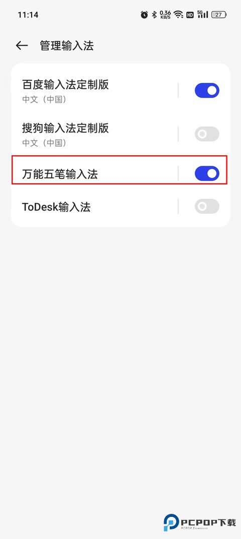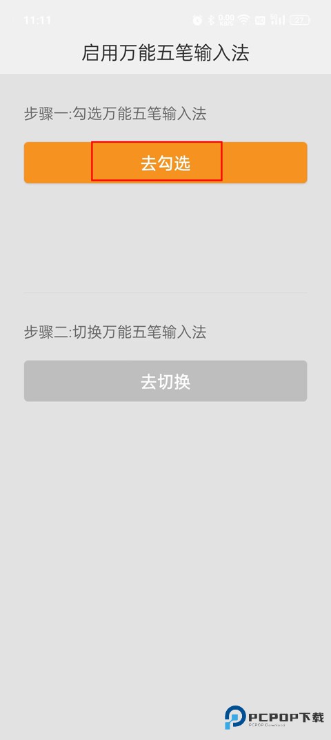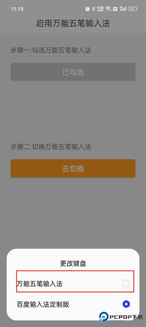4、之后返回上一个页面,点击【去切换】然后就会弹出更改键盘的选项,选择万能五笔输入法就切换成功了。