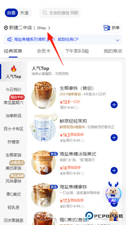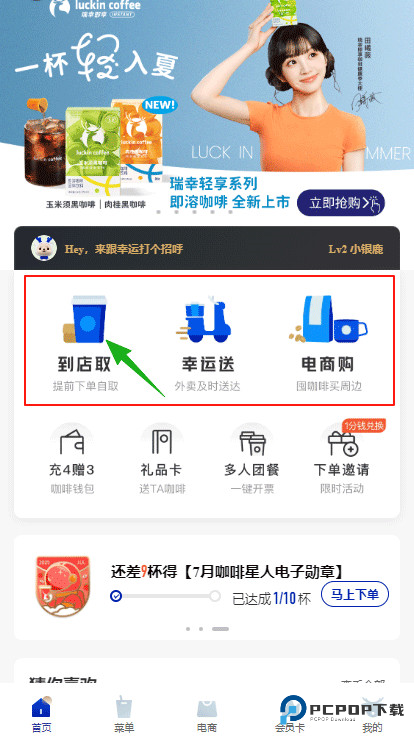 1、打开瑞幸咖啡APP,首页提供了外卖配送和到店自取,这里以到店自取为例;