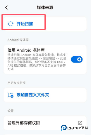 3、在媒体来源这里,点击顶部的【开始扫描】,搜索本地音乐资源。