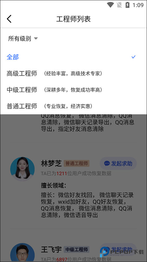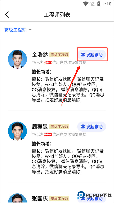 3、选择工程师,然后发起求助即可。