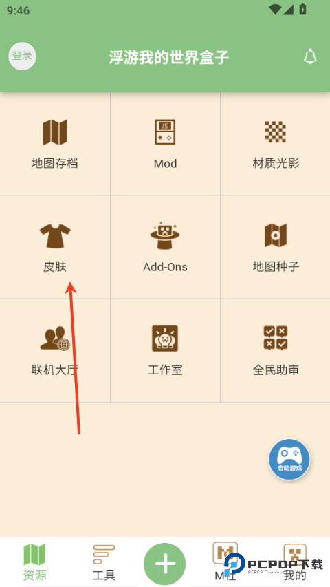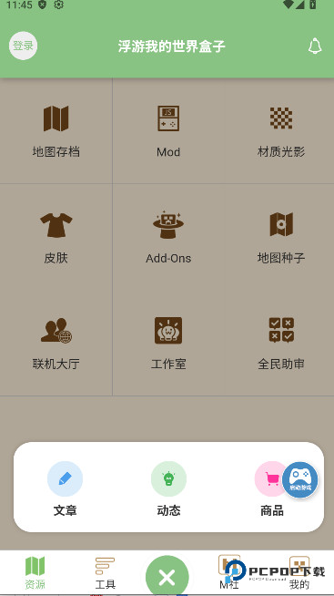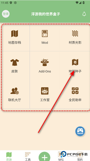 1、在本站下载安装好浮游盒子app官方正版,运行软件,这里有各种功能,如地图存档、mod、材质光影、皮肤等等,你可以根据你自己需要的功能,点击进去;